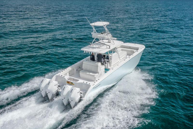 The 39 ft Invincible boat features a twin-step, high-performance hull with a length of 39'2" and a beam of 11'2". Additionally, it has a maximum fuel capacity of 550 gallons, a 260-gallon fish box, and a maximum horsepower rating of 2,100 for its outboard engines.