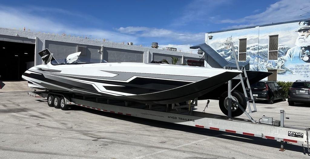 2018 MTI 52, Carbon Layup, 8 Seat Cockpit, Merc Racing 1350s just back in the boat after refresh at Mercury! Bilge repainted and re-rigged, New Cockpit Seadek, Wrap replaced three months ago (white base paint), 24" Center GPS and two 12" GPS units. Air Conditioning (does not work), Rear View Camera, Pop up Night Vision Camera on deck, Under Water Lights, Aluminum Myco trailer Included. Located in our Ft. Lauderdale Facility