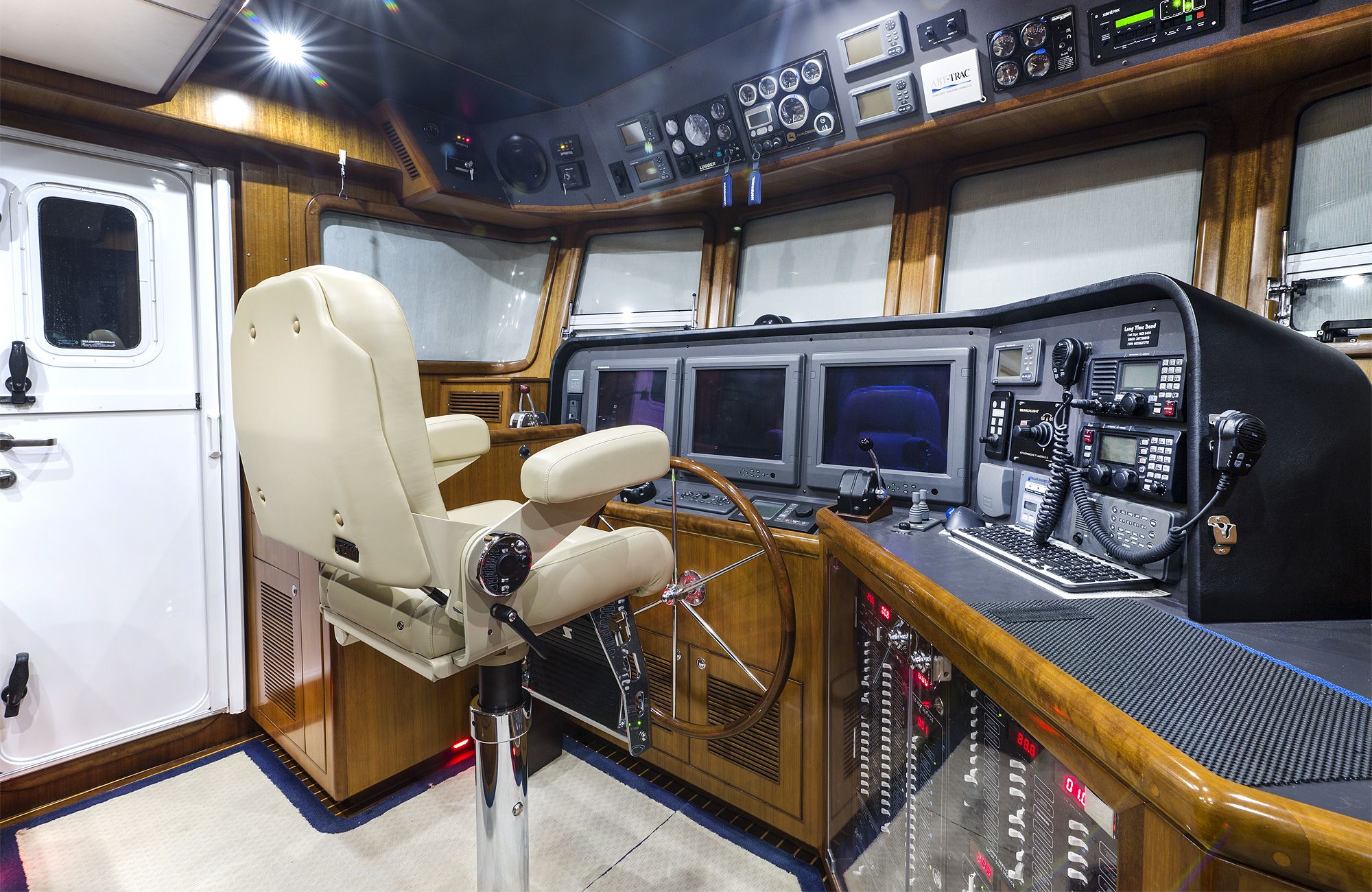 The Nordhavn 55's pilothouse is a commercial-like space located amidships for minimal motion at sea, providing excellent 360-degree visibility. The full-sized helm chair puts the captain comfortably in command of the ship, with all controls and electronics within sight and easy reach.