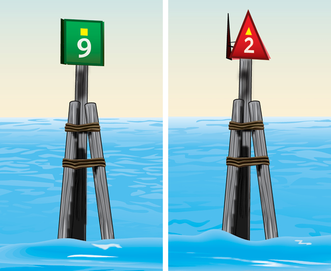 Red buoys and red lights typically mark the right side of a channel when returning from the open sea. Boaters should keep the red channel markers on the right side of their vessel as they return to shore; this rule is easily remembered with the phrase red right returning. Red buoys often feature even numbers, and these numbers usually increase as the vessel proceeds inland source.